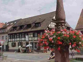 Staffelgiebelhaus mit dem Lindenplatz im Vordergrund. In den Giebeln integrierte Stufen ("Staffeln") gaben dem Haus seinen Namen. Es wurde im Jahr 1605 erbaut und mehrmals umgebaut. Auf dem Lindenplatz stand der ursprünglich älteste Baum der Gemeinde. Der Lindenbaum wurde im Jahr 1870 gepflanzt und musste im Jahr 1996 aus Sicherheitsgründen durch eine Neupflanzung ersetzt werden.